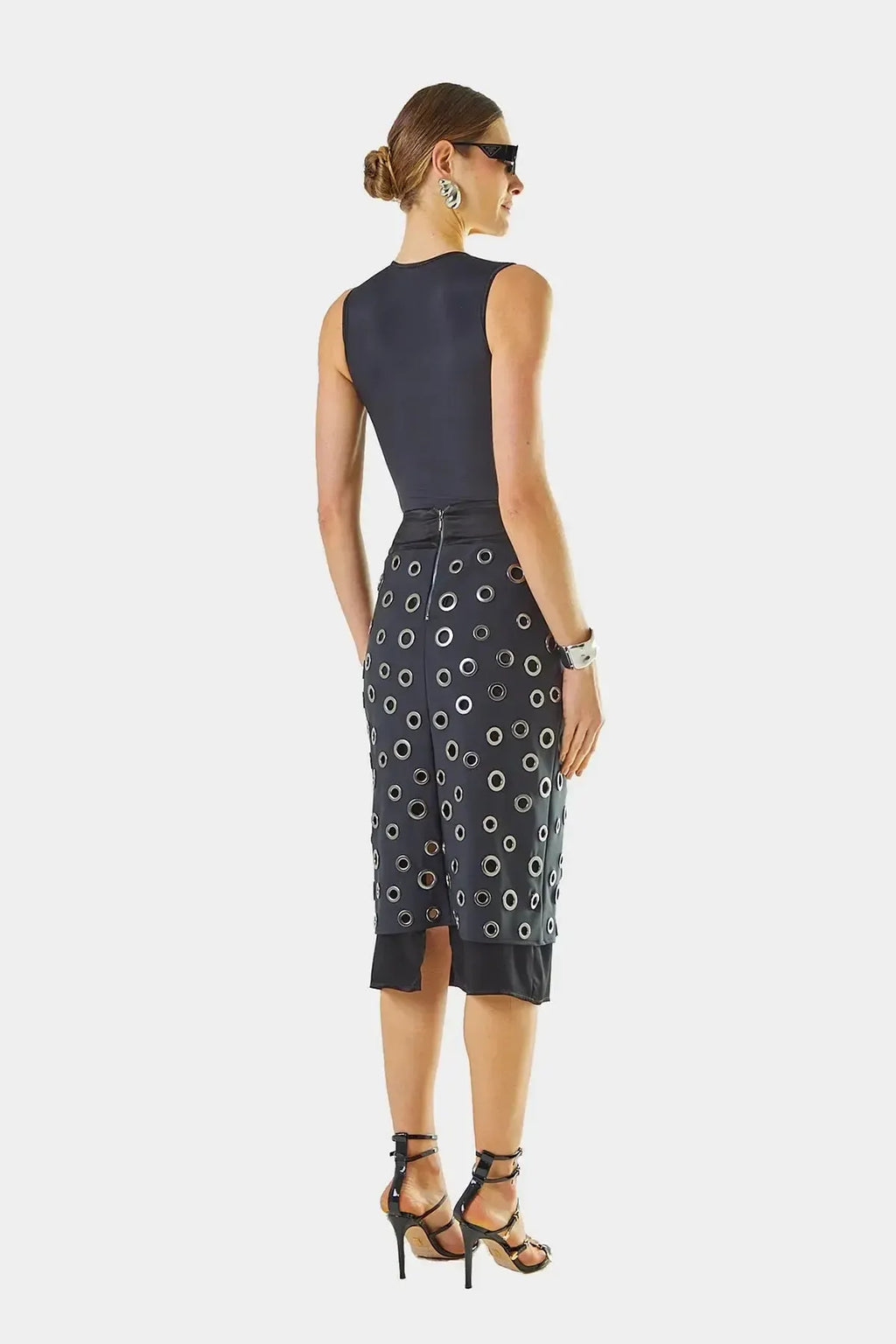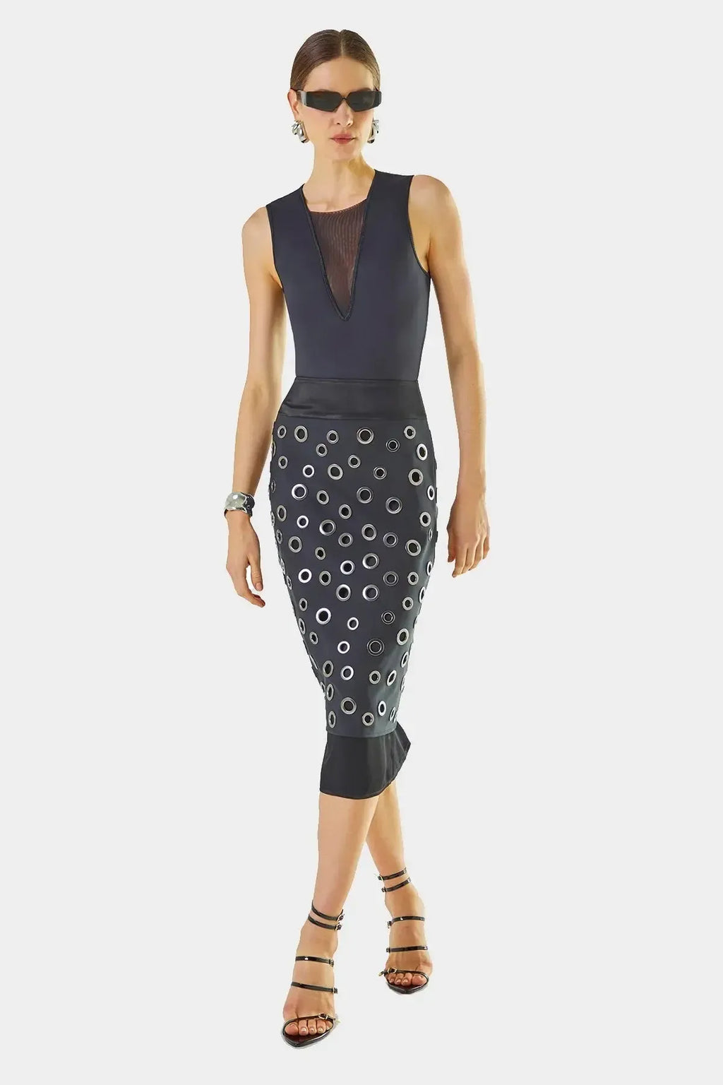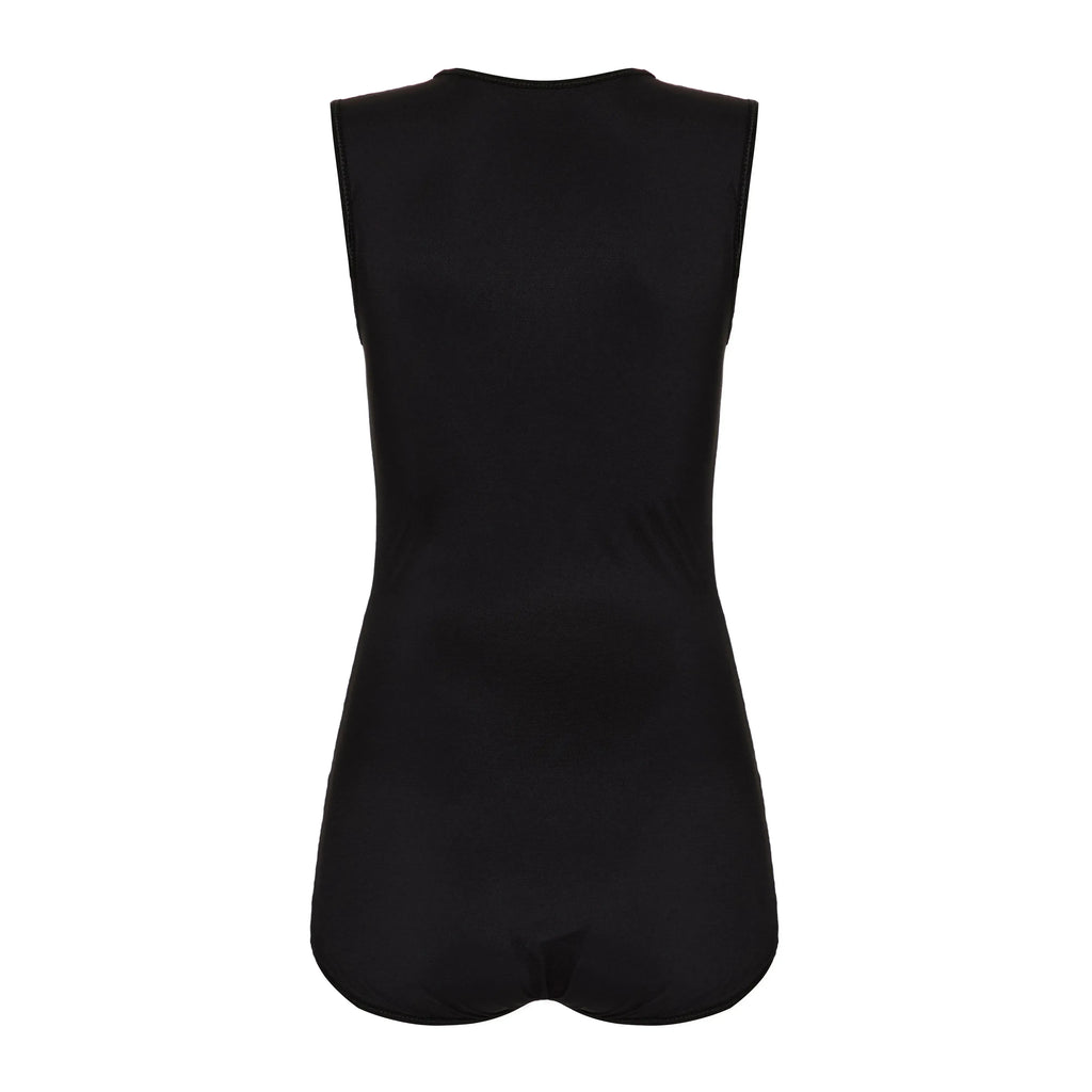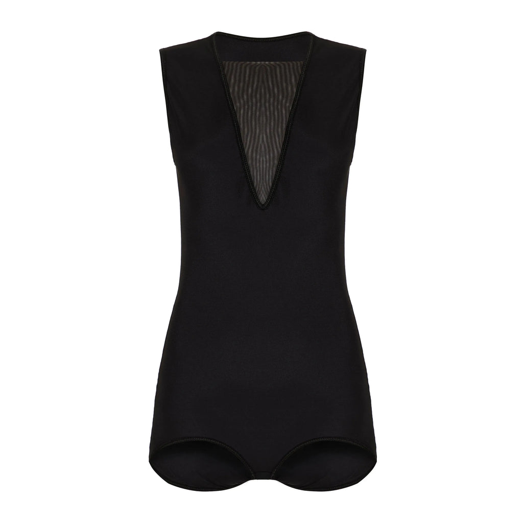 Body regata, confeccionado em tule. Decote "v' com transparência em tule. Bumbum retrô. Fechamento no fundilho.