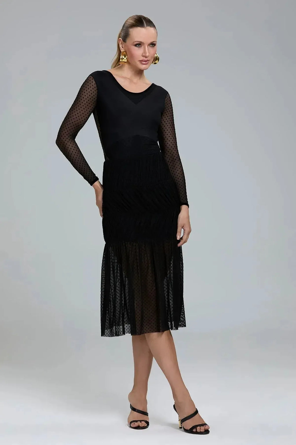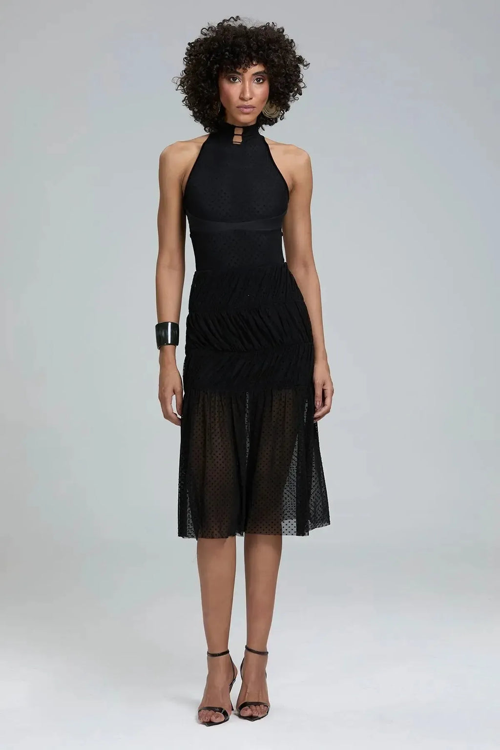 - Detalhes: tule drapeado nos recortes em camadas